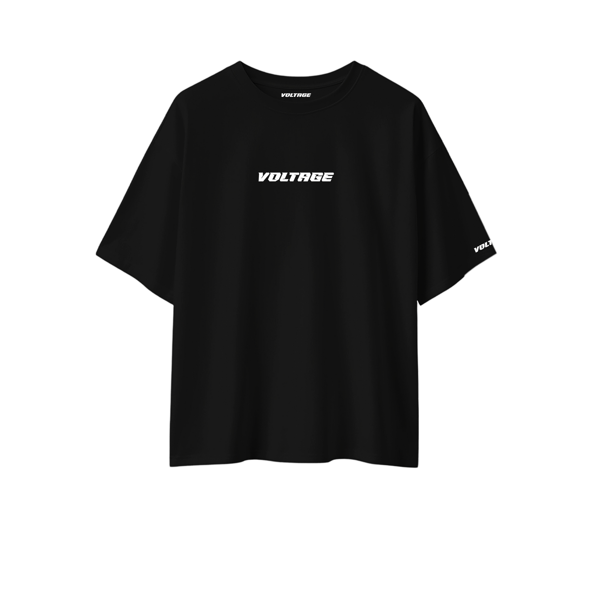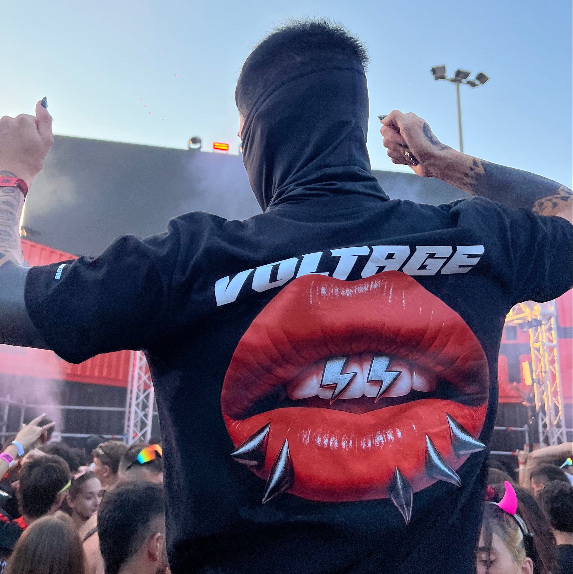 Camiseta negra con estampado de labios rojos, grillz y pinchos metálicos.
